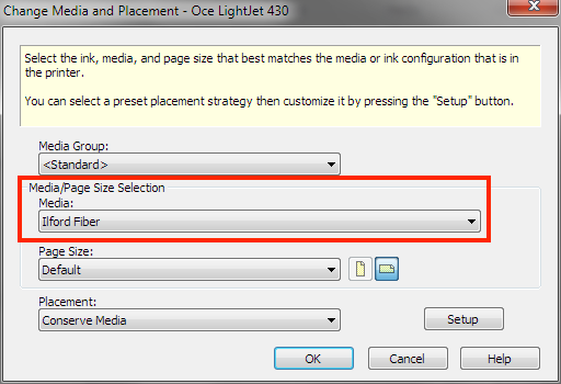 - On the right side click Change… and select the paper type list that is loaded in the LightJet from the Media.